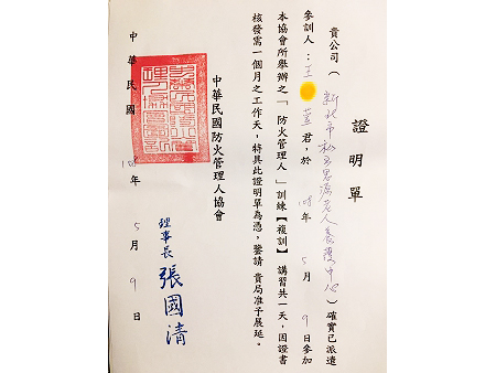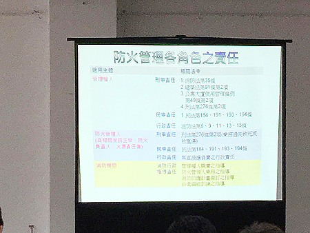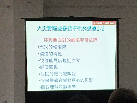 服務介紹 活動剪影 日常活動 2019/05/09 消防複訓 消防管理人,3年複訓一次,我今天又再當好學生了,非常認真地做筆記,《消防法》修改,值得注意,也對此次,衛福部附設醫院火災,護理人員被提訴之事,探討問題與正當性,覺得公安真的非常重要,這應該是全民共識維護,而不是針對某些特定行業,每次的公安事件,無論是否是人為的因素,都應該時時防患於未然,要有防護意識,以免因為疏忽,而遺憾終身! 返回